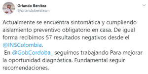 El Ministerio de Salud en su más reciente informe reportó un nuevo casos de contagio de la COVID-19, en el departamento de Córdoba.
