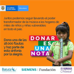 Bogotá. El Ministerio de Cultura, la Fundación Nacional Batuta, en alianza con, Fundación Siemens y Yamaha Musical, a través de la iniciativa ‘Donar es una nota’, buscan recolectar $270.000.000 para la compra y entrega de 18 mil flautas dulces soprano, en 87 municipios del territorio colombiano.
