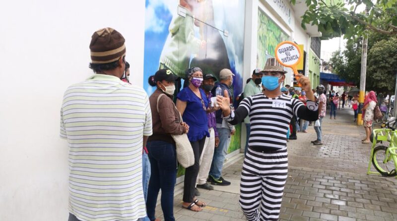 Mimos han sido ubicados en diferentes zonas de la ciudad en donde confluyen personas y, con su cómica y jocosa forma de actuar, le indican a los ciudadanos la importancia del distanciamiento físico, uso del tapabocas, lavado de manos y cumplimiento del pico y cédula.