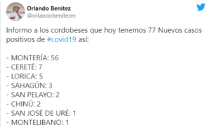 @CordobaSalud informa que en Córdoba se registran 77 nuevos casos positivos por la Covid19: Montería 56, Cereté 7, Lorica 5, Sahagun 3, San Pelayo 2, Chinú 2, Planeta rica 3, Montelíbano 1, San José de Uré 1.