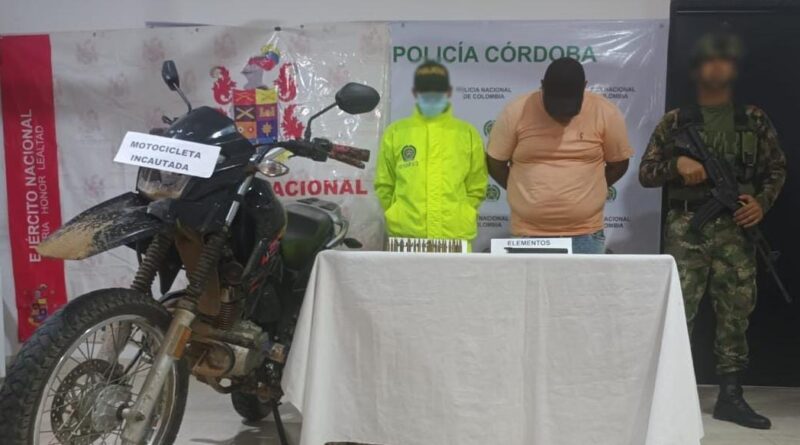 El capturado, fue dejado junto con el material de guerra y la motocicleta incautada, a disposición de la Fiscalía 41 local de Tierralta, ante la cual tendrá que responder por el delito de fabricación, tráfico y porte de armas, municiones de uso restringido, de uso privativo de las fuerzas armadas o explosivos.